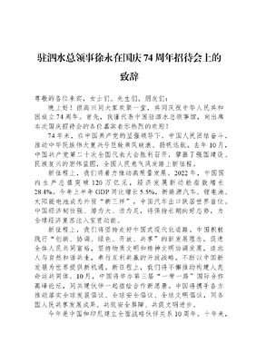 驻泗水总领事徐永在国庆74周年招待会上的致辞.docx
