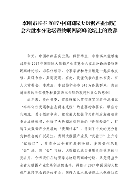 李刚市长在2017中国国际大数据产业博览会六盘水分论坛暨物联网高峰论坛上的致辞.docx