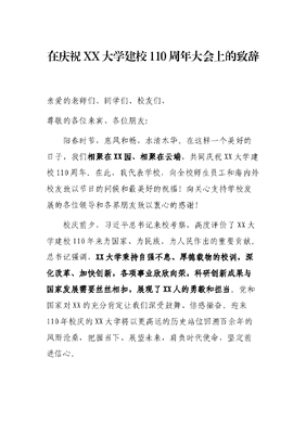 在庆祝XX大学建校110周年大会上的致辞.docx