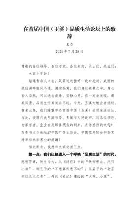 在首届中国(玉溪)品质生活论坛上的致辞.docx