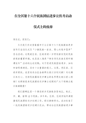 在全区第十六个民族团结进步宣传月启动仪式上的致辞.docx
