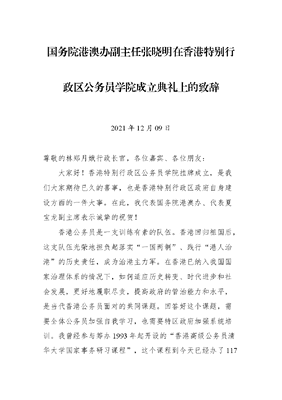 国务院港澳办副主任张晓明在香港特别行政区公务员学院成立典礼上的致辞.docx