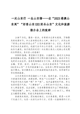 一次山东行 一生山东情——在“2023港澳山东周”“好客山东 好品山东”文化和旅游推介会上的致辞.docx