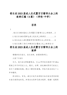 (4篇)校长在2023届成人仪式暨百日誓师大会上的致辞汇编(学校-中学).docx