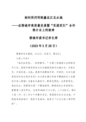 相约两河明珠 赢在江北水城---在聊城市高质量发展暨“双招双引”合作推介会上的致辞.docx
