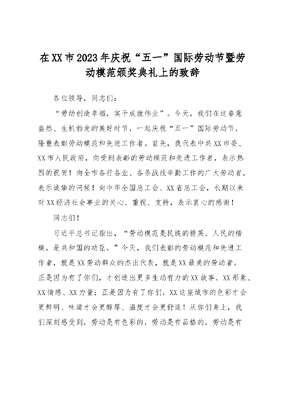 在XX市2023年庆祝“五一”国际劳动节暨劳动模范颁奖典礼上的致辞.docx