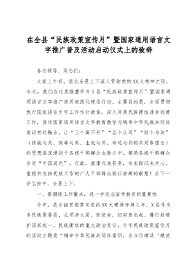 在全县“民族政策宣传月”暨国家通用语言文字推广普及活动启动仪式上的致辞.docx