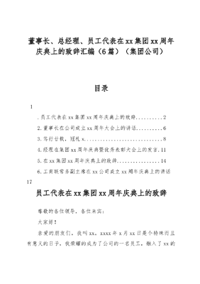 (6篇)董事长、总经理、员工代表在xx集团xx周年庆典上的致辞汇编(集团公司).docx