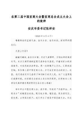 安庆市委书记张祥安:在第二届中国宜商大会暨宜商总会成立大会上的致辞.docx