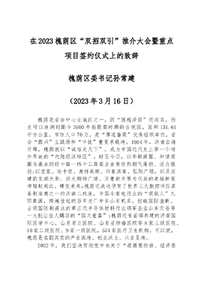 在2023槐荫区“双招双引”推介大会暨重点项目签约仪式上的致辞.docx