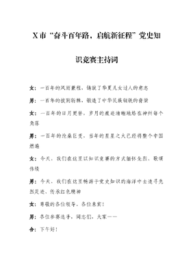 X市“奋斗百年路,启航新征程”党史知识竞赛主持词.docx