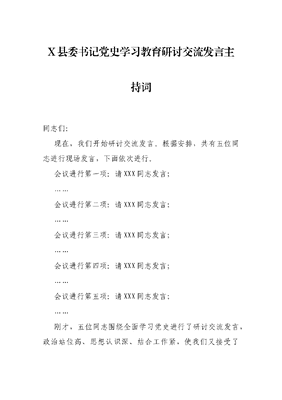 X县委书记党史学习教育研讨交流发言主持词.docx