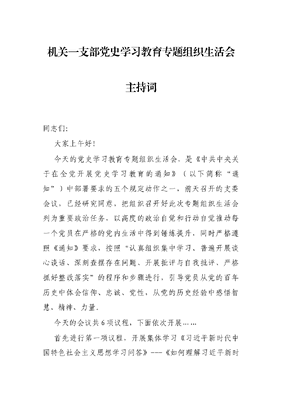 机关一支部党史学习教育专题组织生活会主持词.docx