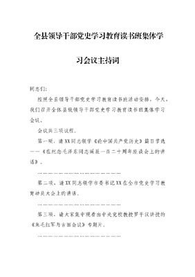 全县领导干部党史学习教育读书班集体学习会议主持词.docx