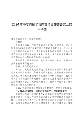 2024年中学党纪学习教育动员部署会议上的主持词.docx