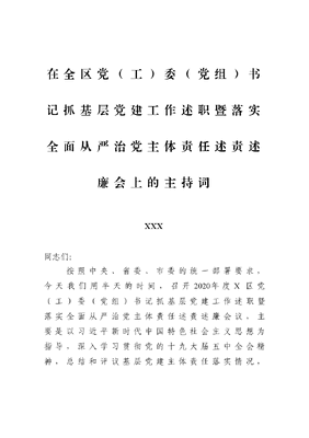 在全区党(工)委(党组)书记抓基层党建工作述职暨落实全面从严治党主体责任述责述廉会上的主持词.docx