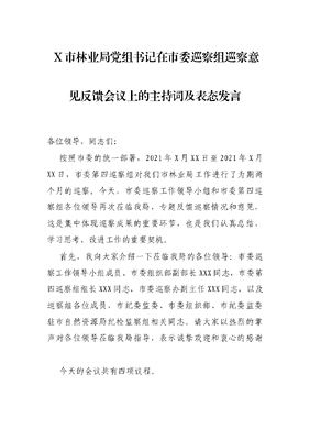 X市林业局党组书记在市委巡察组巡察意见反馈会议上的主持词及表态发言.docx