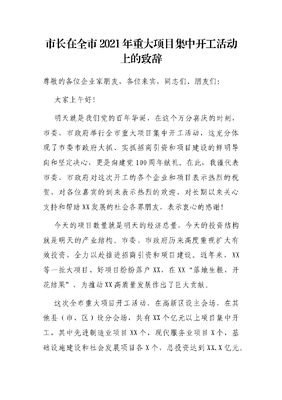 市长在全市2021年重大项目集中开工活动上的致辞.docx