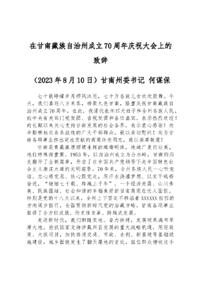 在甘南藏族自治州成立70周年庆祝大会上的致辞.docx