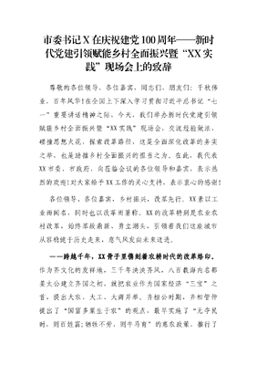 市委书记X在庆祝建党100周年——新时代党建引领赋能乡村全面振兴暨“XX实践”现场会上的致辞.docx