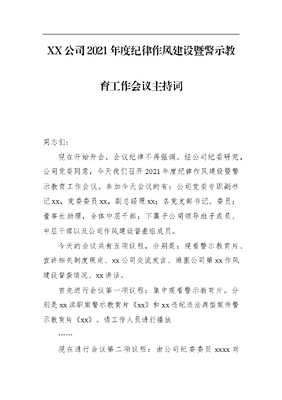 XX公司2021年度纪律作风建设暨警示教育工作会议主持词.docx
