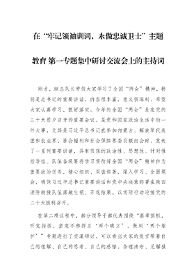 在“牢记领袖训词,永做忠诚卫士”主题教育 第一专题集中研讨交流会上的主持词.docx