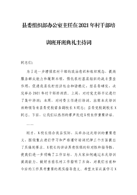 县委组织部办公室主任在2021年村干部培训班开班典礼主持词.docx