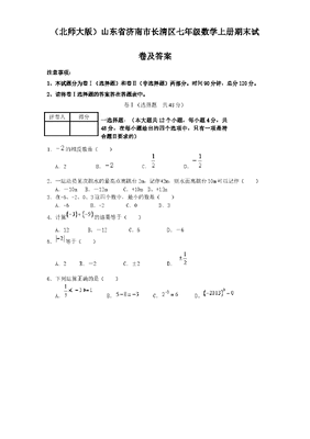 (北师大版)山东省济南市长清区七年级数学上册期末试卷及答案.doc