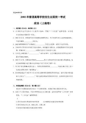 2003年上海市高中毕业统一学业考试政治试卷(答案版).doc
