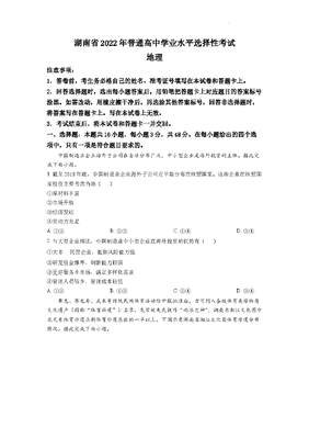 精品解析:2022年湖南普通高中学业水平选择性考试地理试题(原卷版).docx