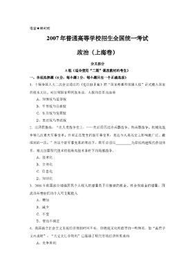 2007年上海市高中毕业统一学业考试政治试卷(答案版).doc