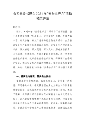 公司党委书记在2021年“安全生产月”活动动员讲话.docx