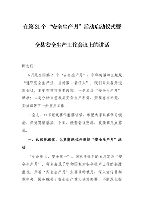 在第21个“安全生产月”活动启动仪式暨全县安全生产工作会议上的讲话.docx