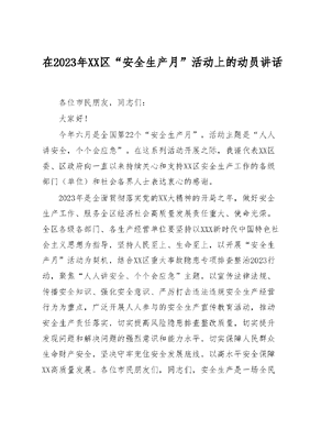 在2023年XX区“安全生产月”活动上的动员讲话.docx