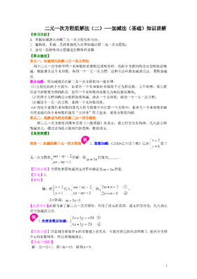初中7年级(下册)二元一次方程组解法(二)--加减法(基础)知识讲解.doc