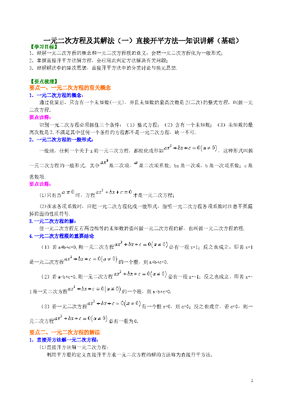 初中数学9年级一元二次方程及其解法(一)直接开平方法—知识讲解(基础).doc