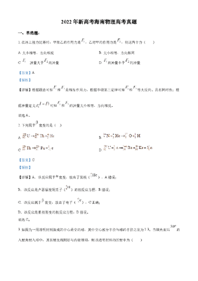 精品解析:2022年新高考海南物理高考真题(缺第6题和第12题)(解析版).docx