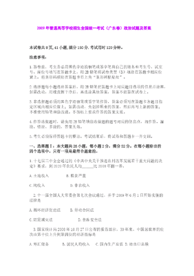 2009年高考广东政治试卷及答案.doc
