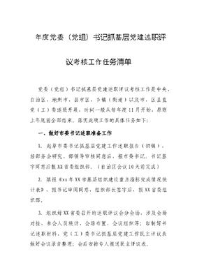 年度党委(党)基党建述组书记抓层职评考核工作任议务清单党委(党组)书记抓基层党建述职评议考核工作是中央、自治区、地州市、县市区、乡镇(街道)以及市、区县直党(工)委逐级开展,时间一般从每年度11月开始,原则上年底前全部结束。落实此项工作的具体任务如下:一、做好市委书记述职准备工作1. 起草市委书记抓基层党建工作述职报告(初稿),经部务会研究、部领导审核同意后,报市委书记。书记签字同意后报XX省委组织部。(自治区会议10天前完成)2. 填报《xx年XX市基层组织建设重点指标完成情况统计表》,报书记审阅同意,组织部长签字后,报XX省委组织部。3. 组织好XX省委召开的述职评议会分会场,涉及会场对接、参会人员统计、会场布置、会议组织等;印制好书记述职材料、党(工)委书记抓基层党建工作民主评议表做好会议录音整理;会后安排专人报送民主评议表。4. 根据XX省委书记点评意见和党委评价意见,制定整改方案和整改责任清单,呈报市委同意后,报XX省委组织部,并印发抓好落实。二、开展市级述职评议考核工作1. 研究制定党委(党组)书记抓基层党建述职评议考核工作方案,报请市委同意后印发。2. 制定区县党委及市直党(工)委书记抓基层党建述职评议考核会议方案,明确述职人员和会议时间,报请市委同意后,上报XX省委组织部。3. 提前10-15天,向区县党委及市直党(工)委书记印发做好抓基层党建述职准备工作的函。4. 提前10-15天,向部分市委党的建设工作领导小组成员单位发函,征求对书记抓基层党建工作的评价意见。5. 起草市委书记在区县党委及市直党(工)委书记抓基层党建述职评议考核会上的主持及点评讲话提纲,至少要在开会前3天呈报书记审阅。6. 与XX省委组织部对接参加市本级述职评议考核会议的领导;向市委请示派员参加一个区县的乡镇党委及区县直党(工)委书记抓基层党建述职评议考核会议的事宜。7. 严格审核区县党委及市直党(工)委书记抓基层党建述职报告,呈报组织部长和市委书记审阅后,校核印制成册,保证参会人员人手一份。8. 起草召开区县党委及市直党(工)委书记抓基层党建述职评议考核会议通知,呈报市委同意后,转交市委办印发。9. 制作党委书记抓基层党建工作民主评议表(A、B、C表)样表。10. 筹备和组织好述职评议考核会。做好会场对接、参会人员通知(2个领导小组成员、基层党员干部代表)、会场布置(桌签、述职席、投票箱摆放)、会议组织等;印制好书记述职材料汇编、党(工)委书记抓基层党建工作民主评议表;准备好市委书记点评讲话;做好会议录音整理;收集和统计民主评议表。11. 向市委呈报区县党委书记抓基层党建工作评价意见及排名等次情况报告,经市委常委会研究后,报XX省委组织部,并反馈区县委书记个人。12. 及时提醒各区县制定区县委书记贯彻落实基层党建工作重要点评意见的整改方案和整改清单,区县党委书记审核签字后,报市委组织部。三、指导区县述职评议考核工作1. 审核区县党委召开的书记抓基层党建述职评议考核会议方案。2. 汇总各区县及各基层党(工)委召开述职评议大会时间安排表。3. 制定参加各区县党(工)委书记抓基层党建述职评议考核会议安排表,起草在各区县党委组织召开的书记抓基层党建述职评议考核工作会上的点评讲话(通稿),报组织部部长审核。四、汇报总结1. 制定书记抓基层党建述职评议考核工作数据统计表。2. 收集各区县党委召开的书记抓基层党建述职评议考核会议全部资料(包含:工作方案、会议方案、点评意见述职报告、民主评议结果、评价意见及定等意见、工作总结)。3. 梳理总结XX市本年度党委(党组)书记抓基层党建述职评议考核工作情况报告,经部领导审核同意后报XX省委组织部。