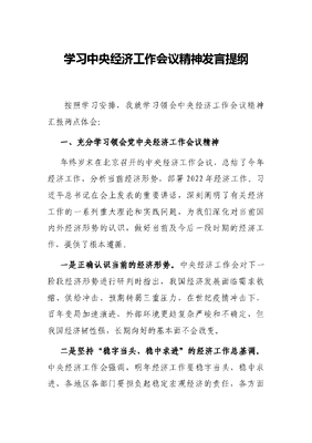学习中央经济工作会议精神发言提纲按照学习安排,我就学习领会中央经济工作会议精神汇报两点体会:一、充分学习领会党中央经济工作会议精神年终岁末在北京召开的中央经济工作会议,总结了今年经济工作,分析当前经济形势,部署2022年经济工作。习近平总书记在会上发表的重要讲话,深刻阐明了有关经济工作的一系列重大理论和实践问题,为我们深化对当前国内外经济形势的认识,做好当前及今后一段时期的经济工作,提供了根本遵循。一是正确认识当前的经济形势。中央经济工作会对下一阶段经济形势进行研判时指出,我国经济发展面临需求收缩、供给冲击、预期转弱三重压力,在世纪疫情冲击下,百年变局加速演进,外部环境更趋复杂严峻和不确定,但我国经济韧性强,长期向好的基本面不会改变。二是坚持稳字当头、稳中求进的经济工作总基调。中央经济工作会强调,明年经济工作要稳字当头、稳中求进,各地区各部门要担负起稳定宏观经济的责任,各方面要积极推出有利于经济稳定的政策,政策发力适当靠前。重点聚焦宏观、微观、结构、科技、改革开放、区域发展社会民生等七个方面的政策,着力稳定宏观经济大盘,保持经济运行在合理区间,保持社会大局稳定。三是深刻领会五个正确认识和把握。新时期内外环境的深刻变化,要求我们我们要把稳经济、稳人心、稳大局作为主基调,把思想和认识统一到中央经济工作会议精神上来,正确认识和把握实现共同富裕的战略目标和实践途径、正确认识和把握资本的特性和行为规律、正确认识和把握初级产品供给保障、正确认识和把握防范化解重大风险、正确认识和把握碳达峰碳中和,以稳求进、以进固稳,在危机中育先机、于变局中开新局。二、按照中央经济工作会议精神编实编好2022年财政预算财政是国家治理的基础和重要支柱,预算是政治活动的依据和边界。贯彻落实中央经济工作会议的精神,直接体现在编好编实2022年的财政预算工作中。按照稳字当头、稳中求进的总基调和尽力而为、量力而行的理财思路,2022年**财政预算将坚持积极、有效、精准、可持续的方针,落实积极的财政政策,处理好防风险和促发展的关系,促进财政金融统筹联动,聚焦州委部署,兜牢三保底线,深耕财源建设,严肃财经纪律。重点抓好以下几个方面的工作。(一)年度收支任务安排突出稳字当头。结合今年财政预算执行情况,以及各级财政收支能力的实际,压实各级收支责任,切实发挥财政收入、支出在支持经济高质量发展中的作用,保障积极的财政政策落地,保持适当的财政支出强度,根据全省财政收支继续保持两个的初步安排,考虑到今年财政可能零增长或负增长的现实,初步建议年度预算收支目标按照收入增长**,支出按照增长安排。(二)预算编制方法上实行零基预算。零基预算就是预算编制不再考虑以往预算安排影响,一切从实际需要出发,结合财力状况,在综合平衡的基础上编制预算,打破支出基数+增长的固有格局,加强财政资源统筹,推进财政支出标准化,坚持有保有压、该减必减,该保障的坚决只增不减,基本支出依据政策和标准,据实测算安排,保障部门正常运转所需支出。项目支出安排不以上年保障水平为基数,坚持资金跟着项目走,严格审核论证,确保支出的必要性、合理性。降低行政机关运行成本,用政府的紧日子换百姓的好日子。(三)支出顺序上坚持尽力而为、量力而行。一是优先保障刚性支出,兜牢三保底线。按照《*刚性支出项目及其标准》规定,安排刚性支出,其中,足额安排三保支出。进一步规范津补贴发放政策,相关经费纳入三保予以保障。二是合理安排化债支出。结合2022年的化债目标,精准测算化债支出数据,合理安排化债支出,切实降低债务风险等级。三是按照《预算法》规定,安排总预备费、州级风险准备金、稳定调节基金等提留支出。四是按照中央、省明确使用用途或要求的配套支出。五是按照**第九次党代会提出的聚焦一个目标,建成三个示范区,形成五大布局,实现六个新突破,奋力夺取**高质量跨越发展新胜利目标要求,抓好重点项目、重点工作保障。六是下沉财力保障基层运转科学安排州对县市转移支付补助。(四)机制制度上注重改革创新。一是继续发挥财税金融统筹联动机制的作用。正确认识一要吃饭、二要建设的时代意义,科学界定公共产品和服务的属性和供给方式,抓好财税金融统筹联动机制作用发挥,加强财政预算与金融工具协同,综合运用政府项目管理、财政贴息财政奖补、风险补偿、投资基金等方式,打造财政投入高效益、金融支持有保障、经济发展高质量的良性互动体系围绕激发微观市场主体活力,破解中小微企业以及项目融资难、融资贵,以及融资落地最后一公里问题。二是下决心推进财源振兴。抓紧财源振兴计划实施。围绕有利于推进三个示范区建设、生态文明建设、乡村振兴和现代产业体系建设的项目,安排有助于巩固