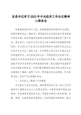 县委书记学习2023年中央经济工作会议精神心得体会统筹国内国际两个大局,统筹疫情防控和经济社会发展,统筹发展和安全。2022年,我国经济社会发展在面对复杂的国际国内环境,面对疫情防控持续反复的特殊时期实现了稳中有进、稳中有升,这是以习近平同志为核心的党中央坚强领导的结果。在12月15日至16日在北京召开的中央经济工作会议上,中共中央总书记、国家主席、中央军委主席习近平出席会议并发表重要讲话。会议系统总结过去一年的经济社会发展工作,回顾近五年来我国经济社会发展的总体形势,全面分析做好2023年经济社会发展工作的面临的形势,提出2023年我国经济社会发展的目标任务,为我们高质量推进2023年地方经济社会发展提供了遵循、指明了方向。贯彻落实好会议精神,作为县委书记,有如下几点感悟和体会。一、坚定信心,提振士气夯根基中央经济工作会议指出,做好明年经济工作,要以习近平新时代中国特色社会主义思想为指导,全面贯彻落实党的XXX精神,扎实推进中国式现代化,坚持稳中求进工作总基调,完整、准确、全面贯彻新发展理念,加快构建新发展格局,着力推动高质量发展,更好统筹疫情防控和经济社会发展,更好统筹发展和安全,全面深化改革开放,大力提振市场信心,把实施扩大内需战略同深化供给侧结构性改革有机结合起来,突出做好稳增长、稳就业、稳物价工作,有效防范化解重大风险,推动经济运行整体好转,实现质的有效提升和量的合理增长,为全面建设社会主义现代化国家开好局起好步。全面贯彻会议精神,推动经济社会高质量发展,县域经济是关键、是基础,作为县委书记,要做到旗帜鲜明讲政治,坚定信心带队伍,真抓实干促发展,带领县委一班人强信心、增动力、铆干劲。要组织班子紧紧围绕全县经济社会发展实际、面临困难、存在问题、优势长版等方面,对标中央经济工作会议精神,开展交流讨论、进行专题研讨,从会议精神中读懂关键、找准支点、吸取力量,不断增强做好2023年经济社会发展工作的动力。要带领班子自觉提高政治站位,不断增强政治判断力、政治领悟力、政治执行力,始终坚定信念,树牢思想根基,衷心拥护两个确立,忠诚践行两个维护,增强四个意识、坚定四个自信,旗帜鲜明讲政治,努力营造全县领导干部忠诚干净、务实担当、奋力拼搏的浓厚氛围。二、突出重点,找准方向明目标刚刚召开的中央经济工作会议,从积极的财政政策要加力提效、稳健的货币政策要精准有力、产业政策要发展和安全并举、科技政策要聚焦自立自强、社会政策要兜牢民生底线等五个方面,明确2023年经济工作要坚持稳字当头、稳中求进加大宏观政策调控力度,加强各类政策协调配合,形成共促高质量发展合力。方向明才能思路清。发展好2023年县域经济工作,重点在围绕产业、企业、项目等抓好谋划、找准方向。做好找准弱项短板,作为县委书记,要紧紧围绕县域内重点产业、重点企业、重要工作,组织开展系统、深入、全面调研,摸清辖区内优势资源,结合全县经济社会发展大局和债务情况,加大重点龙头企业培育和支持力度,引导金融机构加大对小微企业、科技创新、绿色发展等领域支持力度。要全力扩大招商引资,紧紧围绕资源禀赋切实引进一批符合县域实际的项目和企业,持续做好服务保障工作,推进引进企业不断做大做强,不断拓宽财税来源渠道。要紧紧围绕产业布局和发展特点,优化产业政策实施方式,狠抓传统产业改造升级和战略性新兴产业培育壮大,着力补强产业链薄弱环节,推动形成更加科学、高效、持久的产业链条,为经济发展注入源源动力。要始终坚持人民主体地位,落实落细就业优先政策,及时有效缓解结构性物价上涨给困难群众带来的影响;全力做好人才引进工作,鼓励辖区内企业积极引进高端人才,全力服务重点企业做好产品研发、科技创新等工作,让保运转、保工资、保民生底线兜得更牢。三、全力统筹,凝聚力量抓落实行动出成果,实践知成效。中央经济工作会议强调,各地区各部门和各级领导干部要把思想和行动统一到党的XXX精神和党中央关于经济工作的决策部署上来。要坚持把高质量发展作为全面建设社会主义现代化国家的首要任务,完善党中央重大决策部署落实机制,以奋发有为的精神状态和时时放心不下的责任意识做好经济工作。推动县域经济高质量发展,把过去近三年疫情对经济发展的影响不回来,在高质量填平补齐的基础上迈步新台阶。于县域经济发展而言,凝聚力量是前提。县域各部门要始终秉承为民初心,紧紧围绕本职工作强化服务意识,全力营造良好的发展环境,更好为党委政府决策提供重要参谋、保障,更好为产业、企业、项目等提供优质服务,开展更多的一条龙服务、上门服务,让产业发展始终风生水起、企业壮大始终勃勃生机、项目建设始终如火如荼,用担当情怀切实做到权为民所用、情为民所系、利为民所谋。各镇乡(街道)要始终担当属地责任,紧紧围绕企业发展、项目建设、产业布局等加大政策宣传力度,把