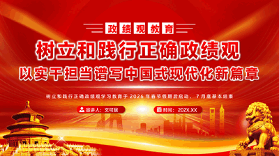树立和践行正确政绩观树立和践行正确政绩观学习教育于2026年春节假期后启动、7月底基本结束以实干担当谱写中国式现代化新篇章政绩观教育宣讲人:文可居时间:202X.XX前言2026 年春节假期后,中共中央办公厅印发《关于在全党开展树立和践行正确政绩观学习教育的通知》,明确在全党开展此项学习教育,以县处级以上领导班子和领导干部特别是"一把手"为重点,7 月底基本结束。这是党中央着眼新形势新任务,深入推进全面从严治党,加强干部队伍建设,推动党和国家事业发展作出的一项重要安排。政绩观是面镜子,映照着党性修养、宗旨意识和格局境界。习近平总书记指出:"要树立和践行正确政绩观,坚持从实际出发、按规律办事,自觉为人民出政绩、以实干出政绩。"这为广大党员干部立身处世、干事创业提供了科学指引和行动指南。前言因为政绩观问题从来不是小事,它关系到党员干部个人成长,关系到群众切身利益,更关系到党和人民事业长远发展。当前,"十五五"时期是基本实现社会主义现代化夯实基础、全面发力的关键时期,各项改革发展任务艰巨繁重,更需要我们把正确政绩观作为选人用人的硬标尺和各项工作的校准器。为什么要专门开展这次学习教育?目录树立和践行正确政绩观一、深刻认识树立和践行正确政绩观的重大意义二、准确把握正确政绩观的核心要义三、扎实推进学习教育各项任务落实四、以正确政绩观引领高质量发展新征程五、结语:写在最后的话深刻认识树立