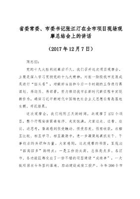 省委常委、市委书记张江汀在全市项目现场观摩总结会上的讲话(2017年12月7日)同志们:党的十九大胜利闭幕后不久,我们召开这次项目观摩会,主要是深入学习贯彻党的十九大精神,对前一阶段我市发展成果进行回头看,对做好当前和今后一个时期的工作进行再谋划、再动员、再部署,努力推动我市在新时代新征程中实现新作为,确保习近平新时代中国特色社会主义思想在青岛落地生根、开花结果。这次观摩会,我们利用三天的时间,共观摩了177个项目,整个行程安排紧凑有序、充实饱满。大家边走、边看、边议、边思考,普遍感到很受触动、很受启发、很有收获,在相互比较、相互学习、相互激励中,进一步凝聚起真抓实干、干事创业的共识和力量。大家感到,这次观摩的项目,呈现出四高四多的特点:一是工作劲头高,总体亮点多。各区市、各功能区都交出了一份不错的项目建设成绩单,一大批项目在今年签约落地、启动建设或竣工投产。今年200个市级重点项目中,前三季度开工在建项目196个,40个项目竣工或主体竣工,完成投资占年度投资计划的95.8%。项目建设是实打实的工作,全市项目建设总体上亮点多,说明大家工作的劲头是足的、力度是大的。二是引进标准高,发展贡献多。在观摩中大家感到,我们引进的项目大都坚持了高标准,对我市新旧动能转换、经济社会发展将形成有力支撑。西海岸新区的上汽通用五菱SUV整车、即墨的一汽—大众(青岛)华东生产基地等,在产值、纳税、吸纳就业等方面都可圈可点。崂山的青岛国际创新园、胶州的青岛传化智能公路港、保税港区全域封关工程等,都是颇具规模和特色的发展平台,辐射带动作用比较强。三是科技含量高,创新元素多。这次观摩的很多项目体现了创新发展理念,强化了创新这个引领发展的第一动力。城阳的国家高速列车技术创新中心、蓝谷的哈工大工业技术研究院、李沧的新旧动能转换创新中心等,都较好体现了科技与经济的融合,促进了产学研深化合作;高新区的奥克生物、莱西的东方雨虹防水新材料等,都站到了各自行业科技的前沿。四是民生投入高,群众受益多。各区市都坚持以人民为中心的发展思想,不断加大民生投入,规划建设了一批重点民生项目,为人民群众办了一批实事。平度中心医院、市北的城市治理指挥中心、市南的南京路小学等,都让老百姓享受到了项目建设的红利。在看到成绩的同时,我们也要清醒地认识到,我市项目建设中还存在一些问题和不足。比如,项目总量还不够多,特别是投资规模大的项目还比较少;项目结构有待进一步优化,领先行业的项目和高科技项目还不够多;项目建设还不够均衡,虽然各区市、功能区在项目建设上都下了很多功夫,但好项目、新项目还是有多有少。各区市要多看别人的长处,多找自己的不足,补足短板、迎头赶上、奋力争先,真正起到项目观摩比学赶帮超的积极作用。发展是党执政兴国的第一要务,发展是硬道理,要发展就必须抓项目。项目是经济社会发展的主要载体。一个好项目,就是一个发展的增长点,就是一个动能转换的支撑点,就是一个财政税收的来源点,就是一个就业富民的立足点。市委、市政府要树立一个鲜明的导向,就是:学习贯彻党的十九大精神,迈进新时代、开启新征程、续写新篇章,必须始终抓牢项目建设这条发展的生命线。这里,我强调四点:一要抓谋划。及时对接国家战略和省里的重大部署,以供给侧结构性改革为主线,围绕实施新旧动能转换重大工程,立足我市产业集群优势,认真谋划一批大项目,争取更多项目纳入国家和省发展战略的大盘子。二要抓引进。继续在招商引资、招才引智上下功夫,做到再加力度、再增干劲,紧跟全球产业和科技前沿,着力引进一批附加值高、竞争力强的大项目、好项目。三要抓推进。按照待批项目抓前期、已批项目抓开工、在建项目抓进度、竣工项目抓投产的思路,倒排工期、挂图作战,在确保安全和质量的前提下,加快项目建设进度,尽快形成实物投资量。四要抓环境。进一步强化服务意识,甘当项目建设服务员,主动服务、靠前服务、周到服务,提升行政效率和服务质量,用政府权力的减法,换取项目建设的加法、经济发展的乘法,以一流的营商环境保证项目引得进、留得住、发展得好。市里各职能部门要多换位思考,勤与基层和企业一起为项目建设出主意、想办法,共同把项目建设搞上去。以上是对这次全市项目观摩会的梳理和总结,下面,重点围绕学习贯彻党的十九大精神,以习近平新时代中国特色社会主义思想为指导,贯彻新发展理念,进一步做好我市工作,根据市委常委会研究讨论的情况,再谈些意见。党的十九大描绘了我国今后的发展蓝图,对各方面工作作出了部署和要求,鲜明提出了中国特色社会主义进入了新时代的重大政治论断。省第十一次党代会和我市第十二次党代会,都对当前和今后的工作作出了安排部署,我们要进一步抓好推进和落实。进入新时代,面对社会主要矛盾的变化,发展的理念和内涵、重点和方式、环境和条件、水平和标准都有了新的更高要求