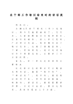 在干部工作培训结束时的讲话提纲同志们:为期X天的干部处(科)长培训,到今天就要结束了。几天来,大家按照培训计划和要求,认真听取辅导、深入学习思考、广泛研讨交流,较好地完成了培训任务,达到了预期目的。下面,受XX委托,我对这次培训作个简要总结,主要讲三个方面问题。首先,讲一讲这次培训的主要特点这次培训总的特点可以概括为两句话,就是短平快、新活实。短平快,就是培训时间不长,但内容安排满、转换快。新活实,就是紧跟新形势、方式方法活、落点比较实。具体体现在三个方面。一是主题鲜明、内容丰富。这次培训,主要目的是学习政策法规、研究解决问题。围绕这个主题,我们区分人才培养、老干部等专题,安排了X次授课辅导,X次分组讨论,编印了干部政策法规学习材料,组织观看了辅导录像和警示教育片,进行了理论考试和大会交流。特别是XX围绕XX作了动员辅导,提出了干部部门应该培养的XX个方面优良作风,指明了抓好干部部门作风建设的方法途径。XX围绕XX,对干部部门需要着力解决的问题进行了强调,站立点高、信息量大、操作性强,大家感到很受益、很解渴。二是学习认真、研讨深入。从了解掌握的情况看,大家都非常珍惜这次学习机会,主动克服困难,有的同志推迟休假,有的同志亲属病故提前归队赶过来,大家自觉排除干扰,全身心地投入培训,表现出了很高的学习热情。尤其是晚上的分组讨论,大家畅所欲言,结合辅导内容和工作实际比较紧,对问题分析得比较透,提出的对策办法也比较具体实在,有价值、有分量。今天上午,X名同志分别作了大会交流,思考深入、针对性强,发言质量都比较高,一定程度上也反映了这次培训的成果。三是组织严密、秩序正规。大家能够以普通干部、普通学员的身份要求自己,自觉遵守各项管理规定,严格落实一日生活制度,不管是出操点名、集合站队,还是参加授课、开展讨论,秩序都比较好,体现了干部部门应有的素质和良好的形象。培训期间,没有不假外出的、没有请吃吃请的,更没有发生违规违纪的问题。特别是几个单位的领导,能够带头遵规守纪、积极参加交流,起到了很好的示范引领作用。其次,讲一讲这次培训的主要收获主要体现在四个方面。一是进一步强化了依据政策法规开展工作的意识。学好用好政策法规,是干部工作者的看家本领。这次培训,我们组织力量把去年以来最新的干部政策法规进行了汇编,安排的授课辅导和研讨交流也都贯穿了对政策法规的学习、理解和运用。大家从新政策中学到了新思想、跟上了新形势、明确了新标准。普遍感到,依据政策法规开展干部工作,学习宣传是前提,不仅自己要学深悟透,还要积极主动向单位领导和部队官兵搞好宣传;严格执行是关键,政策的生命在于执行,再好的政策如果不执行也是一纸空文,必须老老实实地按政策落实、按规矩办事,不断提高政策运用水平;加强监督是保障,必须一级对一级负责、一级为一级把关,对违反政策问题该批评的批评、该追究的追究、该问责的问责,切实维护好政策法规的严肃性和权威性。二是进一步夯实了做好干部工作的素质基础。这次培训,我们没有专门请院校的专家教授来给我们上课,授课辅导安排的都是部处领导,他们讲的都是见人见事的亲身经历,教的都是实在管用的真招实策,目的就是通过紧密联系干部工作实际,面对面地交流探讨,让大家理清基本思路、规范基本流程、掌握基本方法。很多同志讲,通过学习领会关于干部工作的指示精神,深入分析当前干部工作面临的新情况新问题,认清了新形势下给干部工作提出的更高标准要求;通过听取授课辅导特别是多年来工作实践的思考感悟,切实拓宽了思维视野,掌握了具体招法;通过单位之间相互交流切磋,看到了工作中存在的差距和不足,学到了很多好的经验做法,对下一步更好地干好本职工作心里更有底数了,信心更足了。三是进一步深化了对现实矛盾问题的分析研究。解决问题是这次培训的鲜明主题,有什么问题就解决什么问题,是哪个单位的问题就解决哪个单位的问题。培训之前,大家就进行了认真调研思考,做了一些功课。培训期间,针对纯正选人用人风气、优化干部队伍结构、基层干部充实稳定、高精尖人才培养、专业技术干部出口瓶颈等重难点问题,大家共同探讨、集智攻关,不仅形成了一些思想共识,而且提出了许多有见地的意见建议。很多同志都反映,经过深入探讨、相互交流,聚焦了矛盾问题,明确了对策措施,打开了工作思路,培训的过程成了分析问题、查找问题、解决问题的过程,成了统一思想、凝聚共识、推动发展的过程。这次培训结束后,我们还要视情把研究讨论的成果汇编成册,下发基层借鉴实施。四是进一步强化了严格自律的纪律观念。在全党老虎苍蝇一起打、惩治腐败无禁区的高压态势下,我们举办这次培训,本身就释放出了一个强烈信号,就是抓作风先从干部部门抓起。大家深刻认识到,干部部门岗位比较敏感,面临诱惑很多,必须做到打铁自身硬、正人先正己,在加强作风建设上带好头。必须更加敬畏手中权