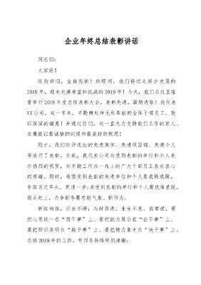 企业年终总结表彰讲话同志们:大家好!旺狗辞旧,金猪迎新!转眼间,我们将送走阔步发展的2018年,迎来充满希望和挑战的2019年!今天,我们在这里隆重举行2018年度总结表彰大会,表彰先进,激励进取!我代表XX公司,向一年来,辛勤耕耘和无私奉献的全体干部员工,致以深深的谢意!并通过你们,向一直大力支持我们工作的家人、亲属致以最诚挚的问候和最美好的祝愿!刚才,我们对评选出的先进集体、先进项目部、先进个人等进行了表彰。在此,我代表公司向受到表彰的单位和个人表示热烈的祝贺,向辛勤工作在一线上的广大干部员工表示衷心的感谢。同时,希望受到表彰的先进单位和个人要戒骄戒躁,争取百尺竿头,更进一步;未受到表彰的单位和个人要找准差距,迎头赶上,力争新年要有新气象、新作为。新故相推,日生不滞;与时俱进,生生不息。我常说,要把心思统一在想干事上、要把能力展示在会干事上、要把胆识体现在敢干事上、要把精力集中在快干事上。总结2018年的工作,有四条脉络特别清晰:——2018是XX公司稳步发展的一年!大雪压青松,青松挺且直。在充满变化的时代,把握趋势是发展的要义。在全体干部员工的努力下,积极开拓市场,寻求合作资源。充分发挥品牌的市场影响力。按照产品创新成立了项目分销中心,汇总分析各方面数据,理顺内部管理,不断培训学习,提升整体销售人员素质。坚持走出去和新旧动能转换的销售战略。在大家的共同努力下,XX公司全年共实现销售收入XX亿元,比2017年同期增长XX%,实现全年销售利润XX,比去年同期增长XX%。——2018是XX公司人才拓局的一年!致天下之治者在人才。企业综合实力的竞争,说到底是人才竞争。古往今来,人才都是发展之本、兴邦大计。公司从单一到多元,项目点多、线长、面广,在工程建设、产业经营、内部管理、后勤保障等诸多方面,面临很多矛盾和挑战,人才需求也在不断提升2018年公司高度重视选贤任能,始终把人才队伍建设作为关系公司可持续发展的关键性、根本性问题来抓。按照定岗定责、竞聘上岗、优化结构的用人导向,打通员工上升通道,全面推行竞争上岗,引进吸纳多名优秀员工,这些新鲜血液为公司的发展带来了新的生机和活力。快速发展中的XX比任何时候都渴求人才,未来我们也会继续出台一系列政策措施营造爱惜人才、宜业宜居的人才发展环境,使各类人才人尽其才、才尽其用、用有所成。——2018是XX公司改革创新的一年!苟日新,日日新,又日新。国家提倡要拓展发展动力新空间,增强发展新动能,以创新推动新旧产能转换。回顾我们公司近十年的发展历程,始终勇立潮头的就是产业结构转型升级。这种转型既来自无中生有的新技术、新业态、新模式,也来自有中出新的传统产业改造升级,就是我常说的多层次的资本市场建立与推进。不改革不创新,就等于原地踏步。XX公司的各个部门、单位,抓节能,抓创新,全年共完成35个节能技改项目,为XX公司节约上千万元。变则通,通则久。各部门、各分公司、项目部在制度创新方面也做出了很多有益探索,按制度办事、按流程做事,我代表XX公司,对大家的改革创新精神表示支持和敬意!——2018是XX公司实干进取的一年!群之所为,事无不成;众之所举,业无不胜。踏踏实实,蓄意进取,全年各部门、各分公司、各项目部都取得了很大进步!干事业,既要仰望星空,更要脚踏实地。仰望星空让我们拥有梦想,而脚踏实地让我们拥有尊严。去年,各部门、各分公司的建设管理都再上新台阶,取得了一定的成绩。公司行政服务部门大力协同、务实进取,服从全局搞建设,保障能力整体提升,为公司发展做出了突出贡献,也深深体现了我们公司正在向团结、协作、亲如兄妹的工作氛围转变。XX公司在过去一年里的成长和进步,正是在座各位干部员工努力的结果!正是你们每日的辛勤付出,兢兢业业,才有了XX公司稳定发展的今天!我代表XX公司,对今天获得先进集体、先进个人的单位和员工,再次表示热烈的祝贺!但是我们还要清醒看到建设发展中存在的主要短板。从工作上看,主要体现为三个不相适应。一是工作思维理念与公司发展形势还不相适应。面对日新月异的经济社会发展和形势变化,存在对客户需求不了解不掌握,对新机制下工作运行模式不思考不钻研,习惯于固有思维模式搞自我循环设计,工作思维跟不上。二是管理水平与公司发展要求还不相适应。存在思路陈旧老套,对一些新理念新技术新应用不学不懂不会,导致工作慢半拍,抓不住机遇。三是工作推进落实与公司标准目标还不相适应。企业发展的快慢取决于落实的成效,工作的差距很大程度上是落实的差距。抓工作落实不严格、不彻底直接影响经营管理质量,直接增加公司运营成本,直接关系公司收益损失。离开了落实,所有美好的愿景都是纸上谈兵,空中楼阁。年复一年,所从事的工作中,总有一些重复的、机械性的工作,但天下难事,必作于易,天下大事,必作