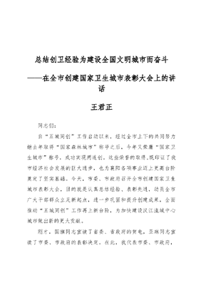 总结创卫经验为建设全国文明城市而奋斗——在全市创建国家卫生城市表彰大会上的讲话王君正同志们:自五城同创工作启动以来,经过全市上下的共同努力继去年取得国家森林城市称号之后,今年又荣膺国家卫生城市称号,成功实现两连创。这些荣誉的取得,既印证了我市经济社会发展的巨大进步,也为襄阳各项事业迈上更高台阶奠定了坚实基础。今天,市委、市政府召开全市创建国家卫生城市表彰大会,目的就是认真总结经验、表彰先进,动员全市广大干部群众立足新起点,进一步巩固和提升创建成果,全面推动五城同创工作再上新台阶,为加快建设汉江流域中心城市做出新的更大贡献。刚才,国旗同志宣读了省委、省政府的贺电,亚琳同志宣读了市委、市政府的表彰决定。在此,我代表市委、市政府,向受到表彰的先进集体和先进个人表示热烈的祝贺!向为创卫工作付出辛勤劳动、作出突出贡献的全市广大干部群众致以崇高的敬意!下面,结合五城同创工作,实现创建全国文明城市目标,我讲三点意见。一、巩固创卫成果,不断丰富城市品牌创建经验国家卫生城市是全国城市卫生管理工作的最高荣誉,集中体现了一个城市的综合实力、城市品位、文明程度、健康水平。多年来,襄阳历届市委、市政府都高度重视国家卫生城市创建工作,始终把创建工作作为改善人居环境、提高市民幸福指数的民生工程,作为提升城市品位、完善城市功能的重要抓手,作为优化城市发展环境、增强要素集聚能力的重大举措,把创建国家卫生城市与创建全国文明城市、国家环保模范城市、国家森林城市、国家生态园林城市紧密结合成为一个相互联系、互为支撑、有机统一的整体,统筹谋划、联动实施、协同推进。多年的坚持不懈,取得了显著成效:①人居环境显著优化。坚持以人为本,深入实施蓝天碧水工程和绿满襄阳行动,扎实推进以棚户区改造为重点的旧城更新,深入开展以综合整治和常态化管理为重点的市容环境治理,形成了开门有绿、推窗赏景、抬头见绿、举足亲水生态园林城市景观,使襄阳天更蓝、水更清、地更绿、城更美。②城市功能和品位显著提升。坚持以强烈的文化意识指导城市建设与管理、统筹城乡一体化发展,城市骨干路网建设快速推进,快速通道初步形成,公共交通设施不断优化,建成区供水、排水、供气、环卫等设施配套完善,城市承载能力不断增强;以文塑城深入推进,山、水、城、洲、文等元素有机融入城市建设,一城两文化特色得到充分彰显,成为汉江流域具有独特魅力的山水园林名城。③市民健康和生命安全保障显著增强。牢牢抓住卫生环境综合整治这个重点,着力培育和强化市民的健康意识、卫生习惯、文明素养,采取多种方式、多种渠道扎实深入推进传染病防治、病媒生物防制、食品安全监管等工作,市民健康和生命安全保障水平得到整体提升。襄阳重大传染病发病率连续多年低于全省平均水平,没有发生重大食品安全事故。④城市影响力和核心竞争力显著扩大。创卫工作既是提高城市品位、塑造城市形象、展现城市魅力的重要抓手,又是推动经济社会科学发展、率先发展、跨越发展的有效载体。扎实有力的创卫工作,提升了城市形象,优化了发展环境,极大地增强了千古帝乡、智慧襄阳的区域影响力和综合竞争力。创建国家卫生城市的成功实践,不仅凝铸了具有鲜明襄阳特色的创卫精神,也给我们留下了深刻的启示:一是领导重视、上下联动,是创卫成功的根本保障。在创卫工作中,各级领导干部率先垂范,深入基层,深入一线,积极发动群众、带着群众一起干。可以说创卫是对党的群众路线教育实践活动的自觉落实和深入推进,赢得人民群众的普遍赞誉。二是以人为本、为民谋利,是创卫成功的重要基础。市委、市政府始终坚持创卫为了人民、依靠人民,成果由人民共享,实施蓝天碧水、绿满襄阳工程,深入开展三无小区、城乡环境综合整治,对中心城区510个三无小区实施环境综合整治,切实帮助群众解决了一大批期盼已久、反映强烈的问题。三是求真务实、标本兼治,是创卫成功的关键举措。突出问题导向,依托12345政府公共服务热线、城管110热线,设立群众投诉咨询平台,广泛听取市民的意见建议,深入开展治乱、治脏、治污、治堵活动,大力实施农贸市场、泥巴路改造工程,解决了一大批群众反映突出的实际问题,使创卫工作取得了实实在在的效果。四是强化舆论、浓厚氛围,是创卫成功的有效抓手。充分利用电视、报纸、网络等各种媒体,开展全方位、高密度、多形式的宣传活动,使创建活动家喻户晓、深入人心,形成了我知晓、我参与、我奉献、我快乐的浓厚创建氛围。五是健全制度、完善机制,是创卫成功的有力保证。制定并实施了《改善民生三年行动计划》,建立市直部门联系包保三无小区综合整治制度,把每月第二个星期六作为全民义务劳动日,组织党政机关、企事业单位干部职工和市民共同整治市容环境,切实增强了市民的主人翁意识和对城市发展的责任感。