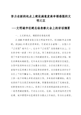 努力在新的起点上建设满意度高幸福感强的文明之区文明城市创建总结表彰大会上的讲话摘要一、立足新起点,增强紧迫感危机感从2005年荣获首批全国文明城市称号,到2008年成功蝉联,到2011年再次获得殊荣,宁波成为全省唯一、全国六个三连冠城市之一。在全市三连冠总结表彰大会上,江东作为唯一的县(市)区代表,作了典型交流发言,这充分体现了市委市政府对江东工作的高度肯定。在社区建设方面,特色品牌越来越彰显,近年来成为全国和谐社区建设示范城区、全国中医药特色社区卫生服务示范区、全区社区教育示范区、省城市社区党建工作示范区等荣誉称号。这些荣誉应该归功于全区上下的不懈奋斗,特别是文明创建、城市管理和社区建设工作一线干部群众卓有成效的工作。多年来的辛勤耕耘,我们收获的不仅仅是沉甸甸的奖牌,更重要的是坚定了克难攻坚、创新突破的信心和决心,获得了许多深刻有益的体会和启示。一是思想高度重视,行动全力以赴。区委、区政府始终把文明创建、城市管理和社区建设作为重点工作来抓,作为社会建设、社会管理的基础性工程来抓,明确目标、制定计划、完善制度、督查落实,四套班子领导身体力行、率先垂范,指导帮助联系点和联系社区,关键时刻冲到一线,起到了很好的示范带动作用。各街道各部门齐抓共管、勇挑重担,在精力上高度集中,在工作上紧密协作,为全面做好这三项工作作出了重要贡献。二是强化科学统筹,整体协调推进。始终把城市管理、社区建设作为文明创建最重要的内容来部署和落实,贯穿于文明创建的全过程。把文明创建作为城市管理、社区建设的主要动力来强化,相互协调、相互促进,全面提升文明创建、城市管理和社区建设水平。三是不断创新争先,勇于走在前列。在文明创建上高点定位、自我加压,确定了在全市走在前列、多作贡献的目标;在社区建设上求特色、求亮点、注重实效、服务群众,涌现了一系列的荣誉和品牌;在城市管理上树标杆、树典型,努力向杭州等先进城市学习,以更高的标准定位引领城市管理水平的提升。四是共建共创共享,充分凝聚合力。始终坚持创建为民、创建惠民、创建靠民,不是图一时的虚名,而是围绕群众需求抓创建,真正使创建过程成为惠民利民的过程。同时,注重发挥广大市民的主体作用,充分调动广大市民参与创建的积极性、主动性和创造性,涌现了许多感人事迹和先进典型。在此,我代表区委、区人大、区政府、区政协向今天受到表彰的先进集体和先进个人表示热烈的祝贺!向为文明创建、城市管理和社区建设付出辛勤努力并作出重要贡献的广大干部群众表示衷心的感谢!文明无止境,创建不停步。对过去工作取得的成绩,我们可以总结,但决不能终结;可以自豪,但决不能自满。我们必须清醒地看到,文明创建工作还有许多不尽如意之处,还有许多需要提高的地方。一是对照先进城市的水平,短板更明显。在近期市里和区里召开的会议上,都与天津和杭州进行比较。和这些城市比,无论是城市建设品位,还是城市管理水平,无论是洁化序化还是美化亮化,无论是内河景观还是主次干道景观,我们的差距是显而易见的,甚至是全方位的。从市内来看,北仑等县(市)区这些年按照中心城区的标准推进城市建设管理,提升的速度非常之快。可以说,我们面临着标兵更远、追兵更近的逼人形势。二是对照市委市政府的要求,责任更重大。今年1月初召开的全市创建新一轮全国文明城市动员大会明确提出要建设更高水平的文明之城,不断夯实文明创建的实力、民生、主体、基层、制度五大根基,新一轮文明城市创建标准将越来越高,城市之间的竞争也越来越激烈。3月中旬召开的全市城市环境综合整治动员大会明确提出要奋战1000天、三年大变样,部署安排了打通断头路、主干道整治、宜居示范小区创建、城中村改造、背街小巷整治五大专项行动,督查督办、对账考核的力度非常之大。江东作为核心城区,责任更重、要求更高。三是对照现代化核心城区的定位,任务更艰巨。区第八次党代会明确提出,要深入实施两强两品战略,全力推动六大跨越提升,全面建设现代化核心城区。在城市形象功能、文化软实力、社会和谐程度等方面,对照标准和要求,还有较大差距,都需要我们一项一项去落实,一个一个去突破。而且时间不等人,离市委市政府搬入东部新城满打满算也只有半年时间了,必须在城市管理水平方面再上新台阶、实现新突破。四是对照市民群众的期待,压力更凸显。当前,市民群众对城市管理和社区建设的关注度也越来越高,而且市民群众关注的焦点切换很快,去年是断头路,前段时间是马路坑洞,现在则是菜市场和专业市场周边环境。近两年收到城市管理和社区建设类的建议和提案达200多件,占总量的一半以上。总之,无论是城市基础设施还是配套设施,无论是硬件还是软件,无论是社区服务还是社区管理,无论是老小区还是城中村,都还有许多经不起细查的区域、经不起细挑的环节。站在三连冠的新起点,全区各级各部门一定要继续保持勇