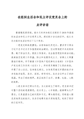 在组织生活会和民主评议党员会上的点评讲话根据镇党委安排,我今天来参加我们支部班子2018年度组织生活会和民主评议党员工作,通过刚才会议的召开,我认为这次组织生活会有以下几个特点:一是党支部高度重视,会前准备扎实充分。重点学习领会习近平总书记关于加强党的政治建设,坚决贯彻党中央决策部署,敢于担当负责,狠抓工作落实,突出基层党组织政治功能,提高基层党建工作质量,防止和克服形式主义、官僚主义等重要指示精神,学习掌握《中国共产党纪律处分条例》《中国共产党支部工作条例(试行)》,所有党员都做了认真的准备,开展了谈心谈话,征询意见建议,全体党员相互开展的批评与自我批评诚恳、真切、深刻,有针对性。此次会议开出了好的氛围,开出了好的境界,真正起到了出汗、排毒、红脸、心跳的效果。二是支部书记带头示范,为大家树立了标杆。党支部书记对整个活动的进展情况,抓在手上,心中有数。能够带头从严要求,认真查摆自己的问题和不足,带头揭伤疤。同时虚心接受其他同志的批评,负责任地带头批评其他党员,起到了很好的示范作用。三是自我批评严肃认真,剖析根源触及灵魂。每名党员都能把聚光灯打在自己身上,着重从认真学习贯彻习近平新时代中国特色社会主义思想,树牢四个意识、坚定四个自信、坚决做到两个维护和履职践诺、担当作为、真抓实干、遵规守纪等方面,把自己摆进去,找差距,做到对征求到的意见不过滤、不遮掩,有回应,有交代。四是相互批评一针见血,真刀真枪。坚持从诚恳、团结同志的角度,有一说一,点穴位,讲问题,不拐弯,不铺垫,气氛很好,起到了红脸出汗、加油鼓劲,凝心聚力、提神励志的效果。借这个机会,我向XX党支部全体党员提几点希望:一要继承好传统。组织生活会是我们党的一项好传统,是增强班子团结沟通的一项好制度,希望不仅要经常开,而且要像本次会议一样,务求实效,力争把每一次组织生活会都开成团结奋进的会议,加油鼓劲的会议。二要解决好问题。对这次组织生活会征求的意见,大家在会上提出问题,要本着有则改之无则加勉的原则,理性看待,认真解决。对能立即解决的马上解决,立改立行;对需要一定时间才能解决的,要明确时限、明确责任人,一项一项地抓好落实。三要运用好成果。对这次组织生活会,以及在解决问题过程中的一些好做法、好经验,能用制度巩固下来的,尽量用制度巩固下来。同时运用组织生活会成果,推出工作新举措、规范工作新制度、树立单位新形象。我的讲话完了,谢谢大家。
