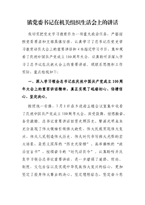 镇党委书记在机关组织生活会上的讲话我切实把党史学习教育作为一项重大政治任务,严格按照党委要求和支部具体安排,认真学习了总书记在党史学习教育动员大会上的重要讲话和4本指定学习书目,集中观看了庆祝中国共产党成立100周年大会,认真聆听并深入学习了总书记在庆祝大会上的重要讲话。现联系思想和工作实际,重点检视如下:一、深入学习领会总书记在庆祝中国共产党成立100周年大会上的重要讲话精神,真正实现了砥砺初心、倍增信心、坚定决心。按照统一安排,7月1日在乡政府五楼会议室集中收看了庆祝中国共产党成立100周年大会,深受鼓舞、倍感振奋、备受激励。总书记重要讲话回望光辉历史、擘画光明未来充分展现了伟大领袖引领伟大政党、伟大民族实现伟大复兴、伟大人民创造伟大历史、伟大时代书写伟大光荣的宏大场景,是意义深厚的历史光荣榜、高举旗帜的政治宣言书、接续奋斗的时代动员令。认真聆听并反复学习领会总书记重要讲话,进一步增强了道路、理论、制度、文化自信以及实现中华民族伟大复兴的信心,更加坚定了投身伟大事业的决心。坚定理想信念、坚定奋斗意志、坚定恒心韧劲,做好本职工作,努力为党和人民争取更大光荣。二、全面学习习近平新时代中国特色社会主义思想和党中央指定学习材料,真正做到了明理、增信、崇德、立行。扎扎实实学党史、悟思想、办实事开新局,一是坚持不懈用功学,通篇学习《论中国共产党历史》等四本必读书目及指定篇目,及时跟进学习领会总书记系列重要讲话精神,促进了对百年党史的系统掌握,加深了对习近平新时代中国特色社会主义思想的深刻理解;二是消化吸收用情讲,通过积极参加县委举办集中学习班,认真撰写心得体会,进一步加强了对所学知识的强化记忆及融会贯通;三是以史为镜用心看,观看《……》等红色影片、在回顾风云激荡的岁月中深受灵魂震撼、精神洗礼;四是统筹兼顾用力做,围绕学和做结合、知和行统一把学习教育与自身从事工作紧密融合,着眼陈坡实际需求认真做好了陈坡工作。三、对照党史目标要求,还需在主动学习、学做榜样、理论武装上进一步加强。一是主动学习的积极性还需进一步提高。虽然能够按照要求完成党史学习教育规定动作,但主动性、积极性还不够强,经常是等县委统一安排后才去学、才去做,习惯于等到最后、靠到最后,总有拖一拖的心理;经常把工作放在第一位,学习当成软指标。指定学习书目和篇目虽然能够通读,但是精读和有侧重有选择的深入研读还不够,导致对重大历史事件的前后联系、形成的重大历史意义、蕴含的理论知识认识不够深刻。二是学做先进的坚定性还需进一步提升。不管在阅读指定书目、参观革命遗址、观看先进人物事迹报告会中,对其中涌现的崇高精神和先进事迹,当时会感到热泪盈眶、热血沸腾、心潮澎湃,但在实际工作和生活中计较个人得失、避让棘手困难工作的情况还偶有存在,向先进先辈模范看齐紧跟追随的意识和坚定性还不强。三是理论指导实践的自觉性还需进一步增强。虽然非常重视钻研党的基本理论和创新理论,把深入学习习近平新时代中国特色社会主义思想及总书记系列重要讲话精神当做头等大事,但对新思想新理念新要求的理解掌握还不够透彻,用党的创新理论武装头脑指导实践推动工作的效果有待进一步提升。四、具体存在问题分析对照党史学习教育目标要求,对比革命先辈和英模人物,自身还存在一些差距和不足。(一)在坚定理想信念方面还有差距。面对重重包围,革命先辈们没有放弃对理想信念的追求,舍生忘死、前赴后继,用鲜血和生命换来民族独立和人民解放;面对一穷二白、满目疮痍,新中国的建设者们没有向困难屈服,自力更生,艰苦奋斗,成功改变旧貌换新颜。生活在这个国顺民昌的幸福年代,虽然能够做到坚定不移听党话、跟党走,但面对繁重的工作,还偶有喘口气、歇歇脚的想法,说到底还是理想信念方面不足够坚定。(二)在增强历史自觉方面存在不足。在七一讲话中,鲜明表达了我们党强烈的历史使命感和自身的历史定位。作为一名党员干部,一直以来更多是立足岗位、履职尽责,没有把历史、当前、未来贯通起来思考谋划全乡工作,没有完全置身于历史发展的潮流中思考自身的定位,没有从推动历史发展的角度衡量自身的能力和作用,还欠缺应有的历史自觉。(三)在弘扬优良传统方面做得不够。理论与实践相结合、密切联系群众、批评与自我批评三大优良传统,对我们现如今推进各项事业仍然有着强大的指导意义。党成立之初,可以调动的资源十分有限,为了得到广大群众的支持,我们党不辞辛苦的做群众工作,千方百计引导群众跟党走,现在我们可以调动的资源多了,密切联系群众的条件更优越了,但是和群众的距离却有些疏远了,下基层和干部接触的多,面对面接触群众少,密切联系群众的作风有些淡薄了,没有完全做到和群众同甘共苦。五、产生问题的原因一是理论学习不深。对党的历史欠缺系统的学习和研究,对马克思主义中国化理论成果学习的不够全面系统深入,没有