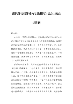 组织部长在部机关专题组织生活会上的总结讲话同志们:在全县上下深入学习领会、贯彻落实习近平总书记在庆祝中国共产党成立100周年大会上的重要讲话精神,热烈庆祝党的百年华诞的重要时刻,今天我们按照省、市、县委的部署要求,利用半天时间召开了一次专题组织生活会。我以一名普通党员的身份,和大家一起过组织生活,一起交流思想、开展批评与自我批评,感到很有收获,很有意义,也很受教育启发。召开组织生活会,是严肃党内政治生活的重要内容。《党章》明确规定:每个党员,不论职务高低,都必须编入党的一个支部、小组或其他特定组织,参加党的组织生活,接受党内外群众的监督。《关于新形势下党内政治生活的若干准则》明确要求,坚持民主生活会和组织生活会制度,会前要广泛听取意见、深入谈心交心,会上要认真查摆问题、深刻剖析根源、明确整改方向,会后要逐一整改落实。上级党组织领导班子成员定期、随机参加下级党组织领导班子民主生活会和组织生活会,发现问题及时纠正。省、市出台的《机关(事业)单位党组织建设标准》也明确要求,支部每半年召开1次党员组织生活会。党员领导干部以普通党员身份参加支部组织生活会。遇有重要情况,及时召开。这些规定要求,为严肃党内政治生活、净化党内政治生态提供了基本遵循。今天这次专题组织生活会,是开展党史学习教育的一项规定动作。根据党史学习教育安排,今年七一前后,各基层党支部要聚焦做到学史明理、学史增信、学史崇德、学史力行,召开一次专题组织生活会。党支部班子要对照党章、《中国共产党党支部工作条例(试行)》和有关规定明确的职责任务,结合正在开展的我为群众办实事实践活动查摆存在的问题和不足。广大党员要对照合格党员标准、对照入党誓词、对照身边先进典型,联系实际进行党性分析,查找自身问题和不足。刚才,听了×书记的对照检查和大家的自我批评以及相互批评,我认为这次专题组织生活会开得比较成功,是一次严肃认真、民主团结、求真务实的组织生活会,达到了团结—批评—团结的目的,也充分印证了部机关和同志们扎实开展党史学习教育的良好成效。开完会议只是走完了其中一步,更重要的任务是抓好存在问题的整改落实。在庆祝中国共产党成立100周年大会上,习近平总书记深刻指出:在新的征程上,我们要牢记打铁必须自身硬的道理,增强全面从严治党永远在路上的政治自觉,以党的政治建设为统领,继续推进新时代党的建设新的伟大工程,不断严密党的组织体系,着力建设德才兼备的高素质干部队伍,坚定不移推进党风廉政建设和反腐败斗争,坚决清除一切损害党的先进性和纯洁性的因素清除一切侵蚀党的健康肌体的病毒,确保党不变质、不变色、不变味,确保党在新时代坚持和发展中国特色社会主义的历史进程中始终成为坚强领导核心!组织部门作为管党治党的重要部门,在继续推进新时代党的建设新的伟大工程中,肩负着神圣职责、重要使命,一定要认真学习领会习近平总书记在庆祝中国共产党成立100周年大会上的重要讲话精神,牢记打铁必须自身硬的道理,增强全面从严治党永远在路上的政治自觉,在严格落实党的制度上走在前、作表率,围绕讲政治、重公道、业务精、作风好要求,建设模范部门、打造过硬队伍。借此机会,我提三点要求,和大家共勉。第一,要旗帜鲜明讲政治。组织部门是党的政治机关,组织工作是党的政治工作。讲政治是组工干部的第一位要求。一要增强政治自觉。坚定党性立场,提高政治站位,在政治原则、大事大非问题上旗帜鲜明、立场坚定,不断提高政治判断力、政治领悟力、政治执行力,在任何时候任何情况下,都要树牢四个意识、坚定四个自信做到两个维护。二要强化政治担当。讲政治不能空喊口号、流于形式,必须以坚决态度、鲜明导向、管用举措把党的政治建设摆在首位、落到基层。选拔干部要突出政治标准和政治考察,教育管理监督干部要突出政治纪律和政治规矩,基层组织建设要突出政治属性和政治功能,人才工作要注重政治引领和政治吸纳,把以党的政治建设为统领贯穿组织工作全过程各方面。三要严守政治纪律组织部门地位特殊、岗位特殊、责任特殊,经常参与党委重大政策制定、重大问题研究,接触领导多、了解敏感信息多,要严格按原则办事、按政策办事、按程序办事、按规矩办事,严守政治纪律、组织纪律、廉洁纪律、群众纪律、工作纪律、生活纪律六大纪律,对违反纪律、破坏规矩的决不放过,对跑官要官、买官卖官的决不姑息,以实际行动让党委满意、干部满意、群众满意。第二,要履职尽责有作为。今年是建党100周年,是实施十四五规划、开启全面建设社会主义现代化国家新征程的第一年,是县乡领导班子换届之年,大事多、要事多,实现十四五开门红、加快经济社会高质量发展的任务艰巨繁重,我们的每项工作都关系大局。今年的时间已经过半,成绩值得肯定,问题也不容忽视。对此,我们将专门召开部务会、组织工作推进会,对下步工作进行专题
